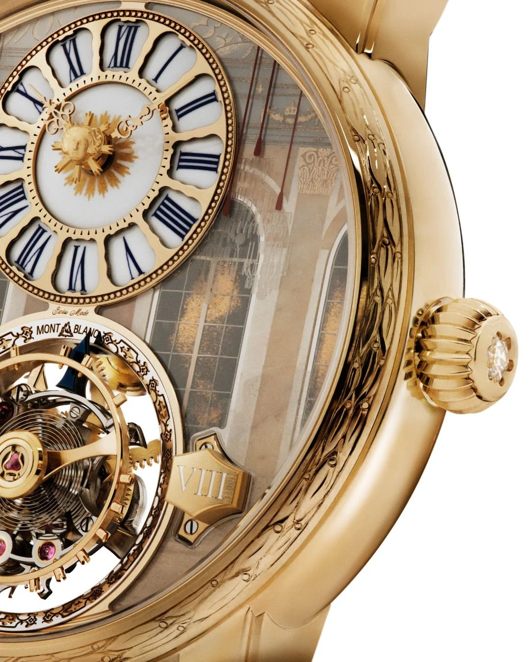The Montblanc Star Legacy Suspended Exo Tourbillon Château de Versailles is not just a timepiece — it’s a full theatrical experience in gold, enamel, and mechanical mastery. Drawing inspiration from the 1745 “Yew Tree Ball” held in Versailles’ Hall of Mirrors, this limited edition (8 pieces) blends haute horlogerie and métiers d’art. In it, Montblanc transports the wearer to candlelit ballrooms and mirrored halls through micro-art, architecture, and motion.