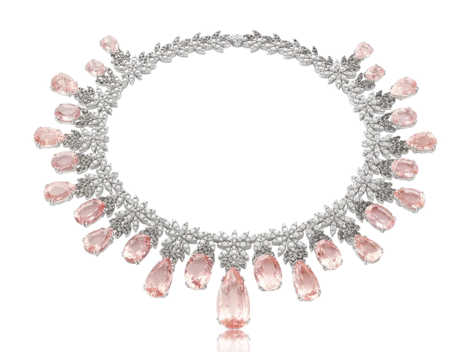 The Ghirlanda Atelier Necklace — centrepiece of the collection, sculpted in 18K white gold, featuring a cascade of morganite stones framed by white and grey diamonds.
