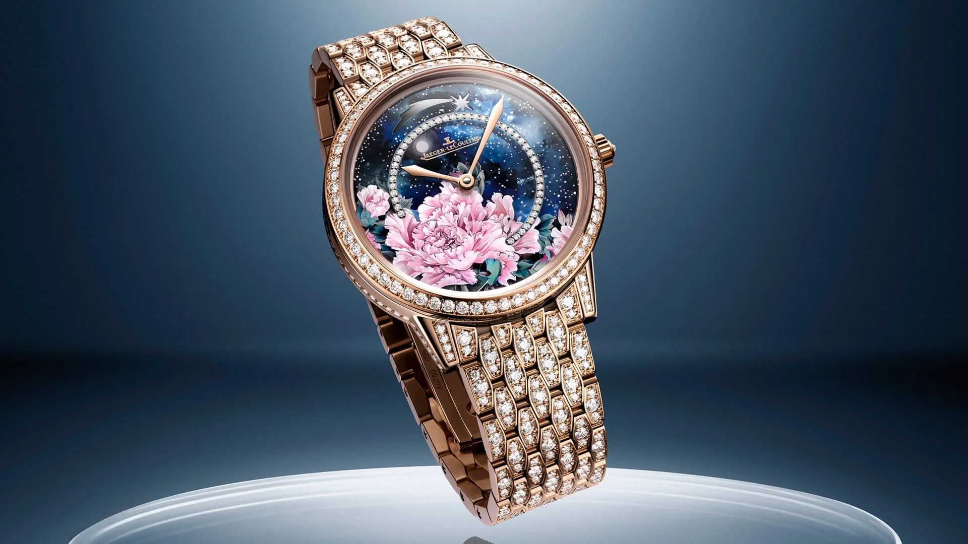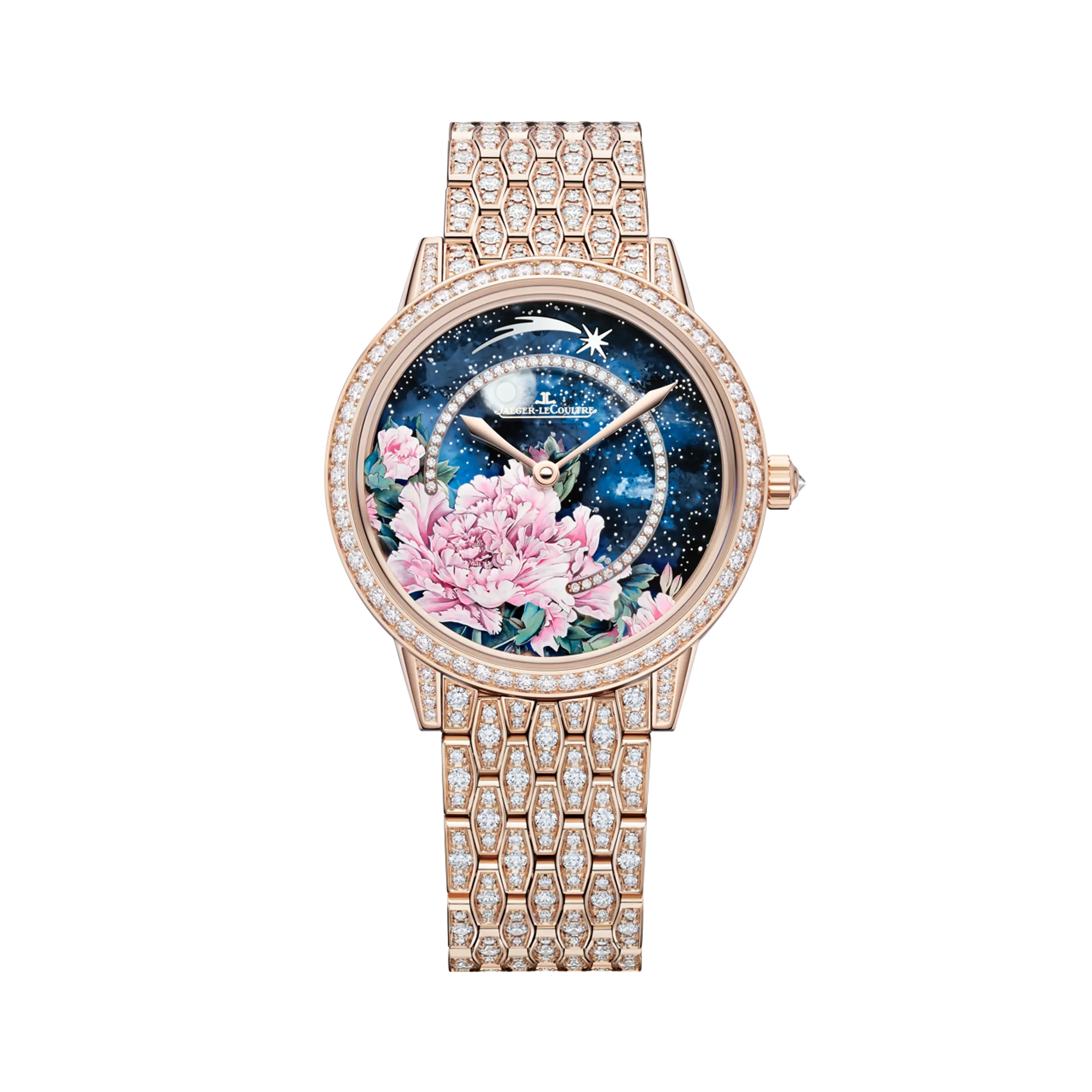 Each of these limited-edition watches is created within Jaeger-LeCoultre’s Atelier des Métiers Rares™, where miniature painting, gem-setting, and traditional crafts converge. The pink peonies on the sapphire disc are hand-painted in nine shades of pink, requiring more than 110 hours of meticulous artistry. Such dedication ensures that every piece is as unique as the starry phenomena it represents.