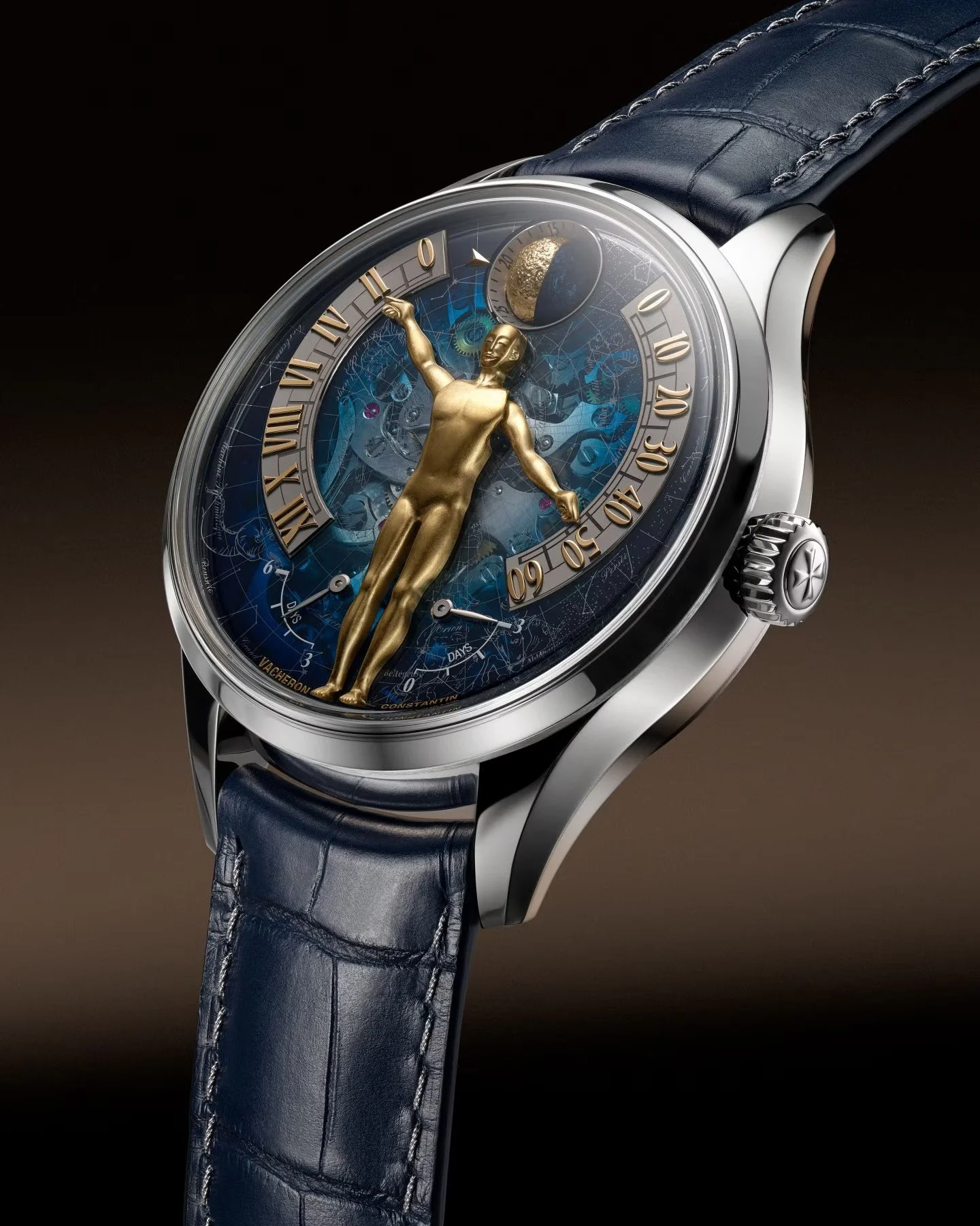 The watch measures 43 mm in white gold, with layered sapphire crystal dials revealing the interplay of depth, relief, and celestial detail. The sculpted figure and moon are crafted in titanium with golden PVD finishes, while the movement itself is adorned with the highest standards of Genevan finishing. Limited to just 20 pieces and available exclusively through Vacheron Constantin boutiques, it represents not only watchmaking mastery but also a philosophical meditation on the human relationship with time and the stars.